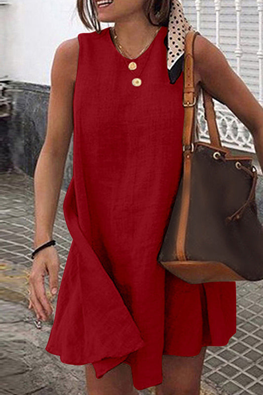 Round Neck Sleeveless Solid Cotton Linen Mini Dress