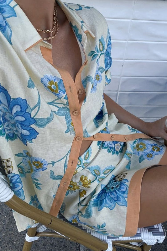 Giselle Linen Blend Floral Print Short Sleeve Shirt and Zipper Mini Skirt Set
