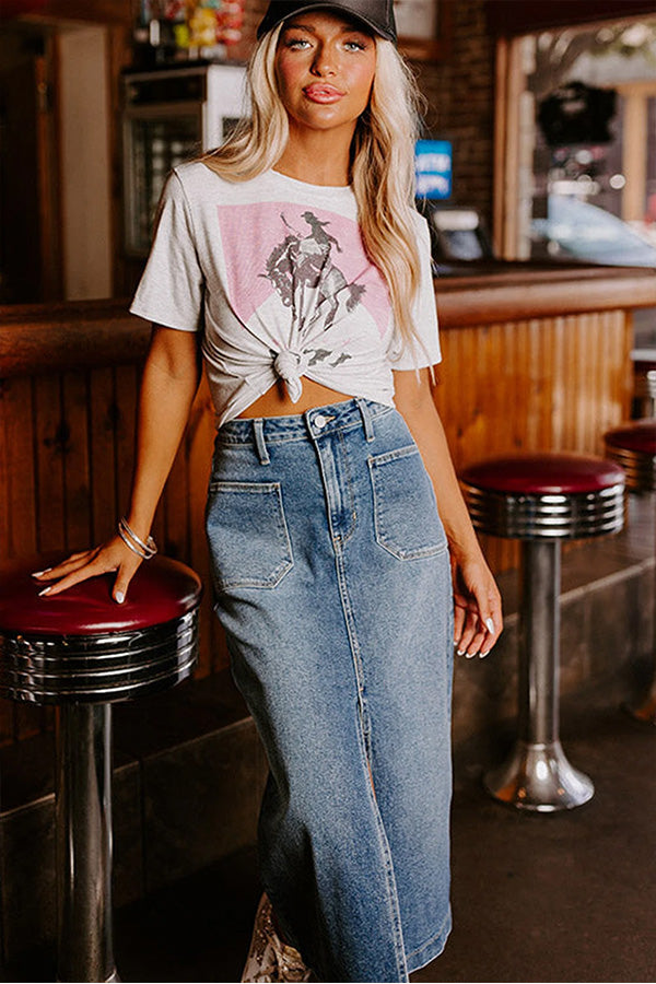Sky Blue 4 Patch Pockets Front Slit Midi Denim Skirt